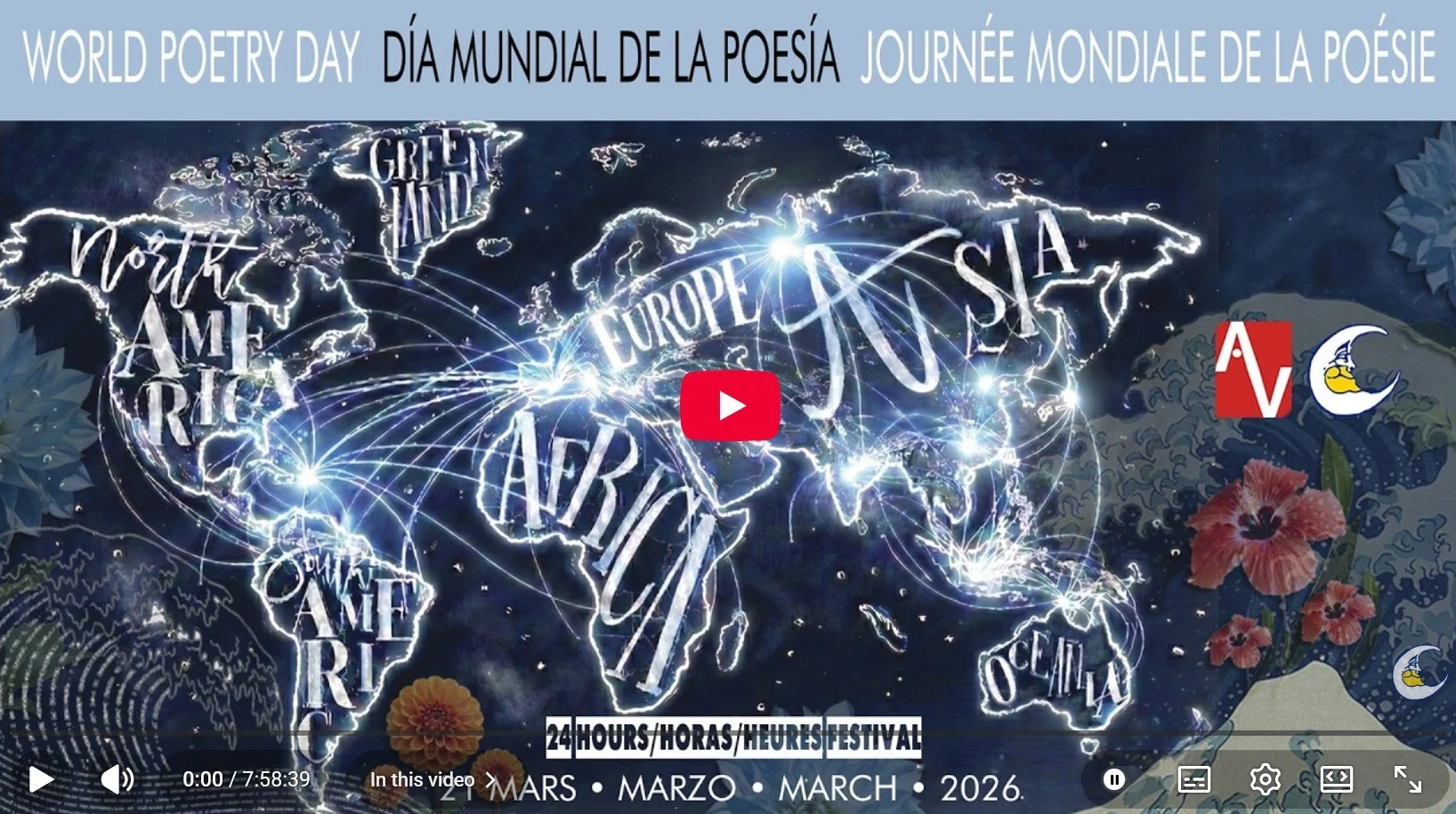 Back in 2000 David organised the first New Zealand celebration, with group readings at venues in Auckland, Wellington, Christchurch, and Dunedin. The World Poetry Day Festival 2026 moved with the times, it took place on social media, with New Zealand restarting play on the first of three recordings 55 minutes in. The event began at Festival Arte Vivo, in Santiago, Dominican Republic, at 12 midnight March 21 and ended at Teatro de la Luna in Washington, DC, at 12 midnight March 22, Eastern Daylight Time (EDT). Festival Arte Vivo and Teatro de la Luna were the two main co-sponsors of the event, with support from the Pontificia Universidad Católica Madre y Maestra in Santiago, Dominican Republic.
